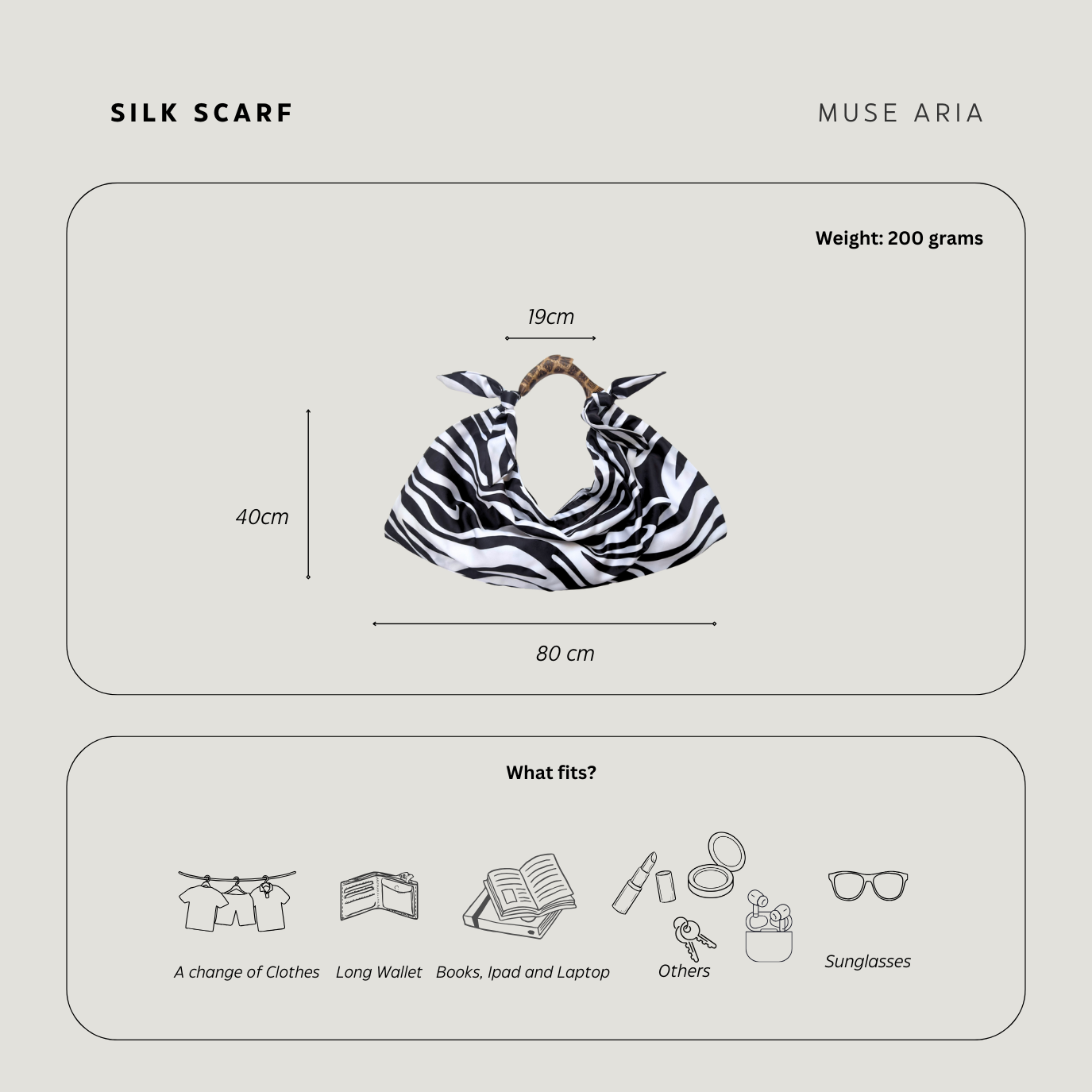 Embrace vibrant elegance with the Silk Scarf Tote. Crafted from a blend of silk & recycle polyester, this playful piece showcases vibrant hues adorned with intricate embroidery and playful patterns.